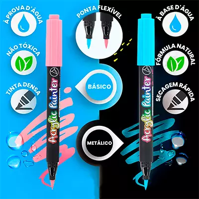 Diferente das outras canetas de pintura do mercado; que escorrem e na primeira lavagem sai tudo, as Canetas Color Brush possuem a tecnologia Acrylic Painter, que torna a tinta mais densa, impedindo o escorrimento e tornado-a permanete em vários materiais depois de seca.