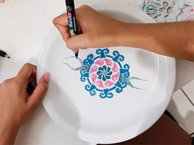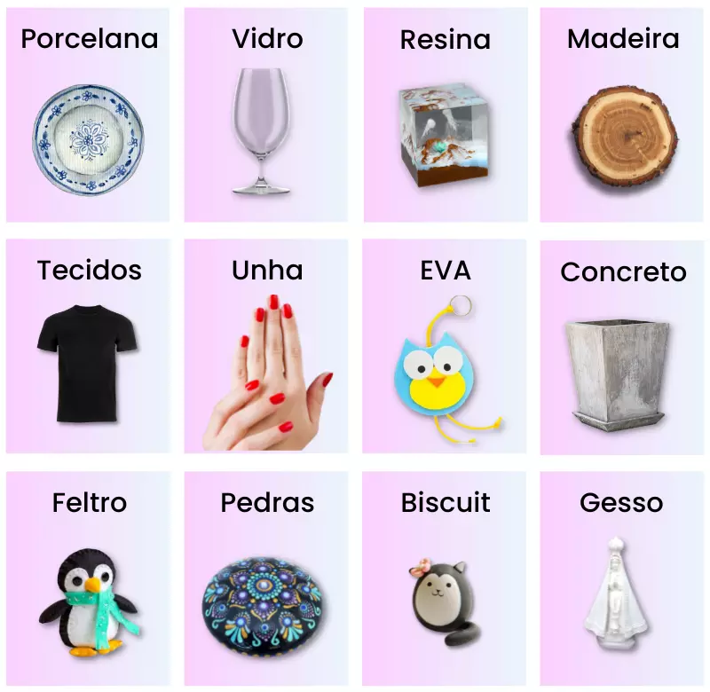 Você pode pintar em vasos de porcelana, xícaras, pratos, camisas, paredes, mesas e muito mais!