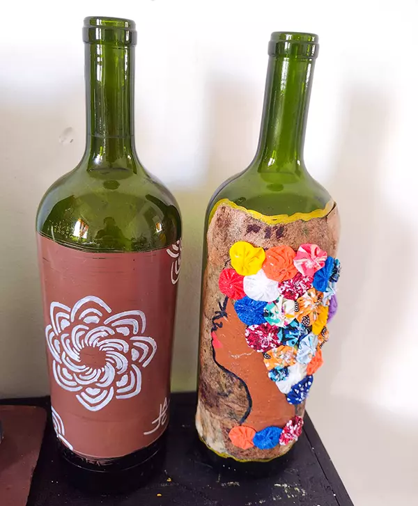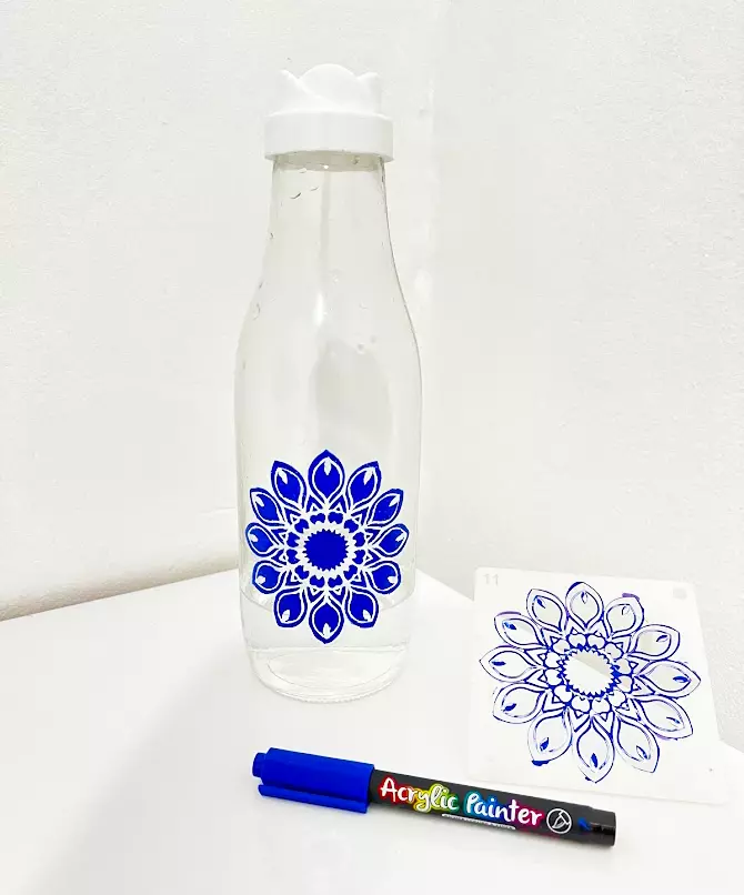 Adorei as canetas e os moldes de pintura. Fiz essa flor na garrafa de vidro e ficou maravilhosa.