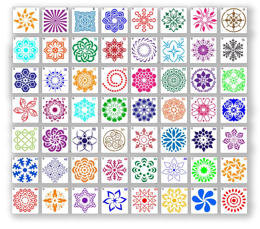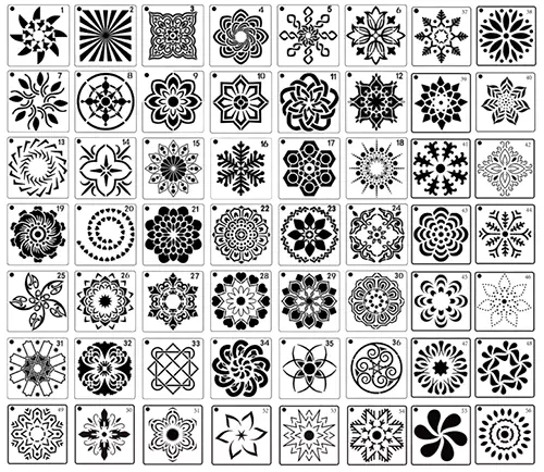 Faça pinturas profissionais em poucos minutos utilizando os moldes de pintura. São 56 designs de tamanho 9x9cm para seus projetos artesanais. basta aplicar sobre a superfície e usar as Canetas Color Brush para pintar por cima!